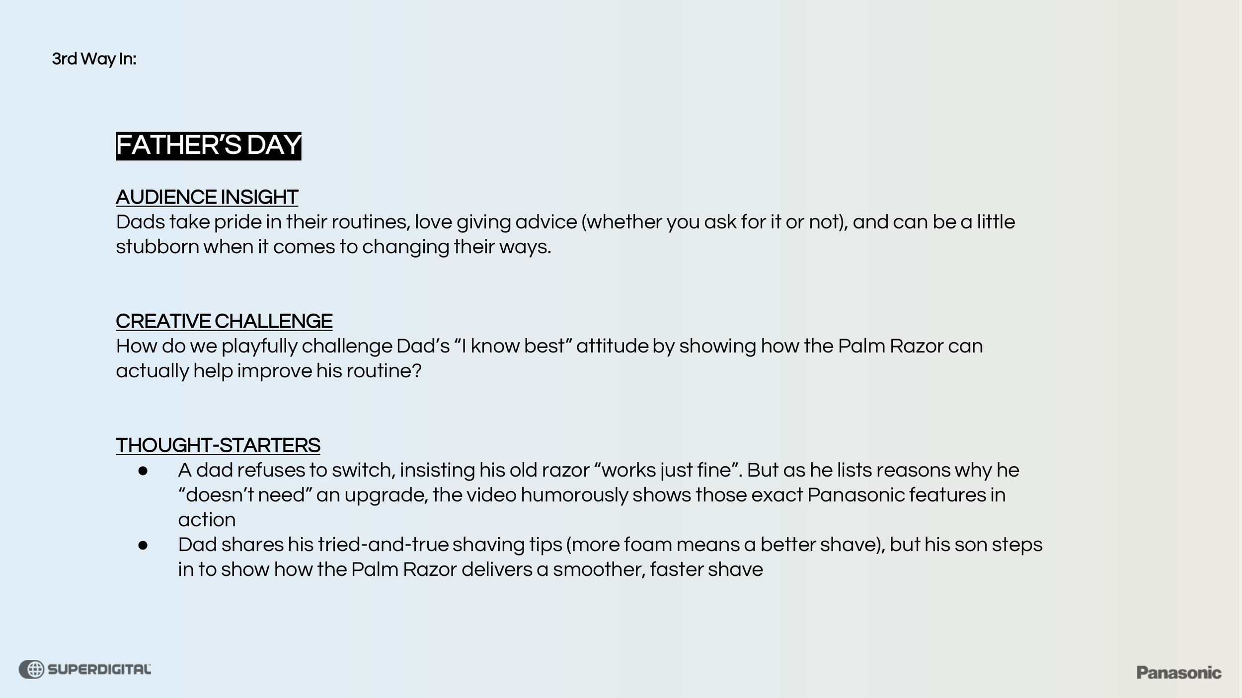 I asked myself that while building a Father’s Day brief for the Panasonic Palm Razor. As a Freelance Strategist at Superdigital, I developed three distinct ways in, each rooted in audience insights, paired with a creative challenge and thought starters to guide the work.
